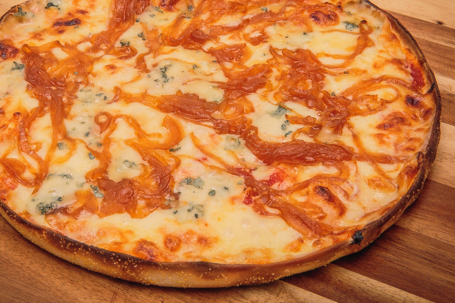 molho pomodori pelati, queijo mussarela, cebola caramelizada e gorgonzola